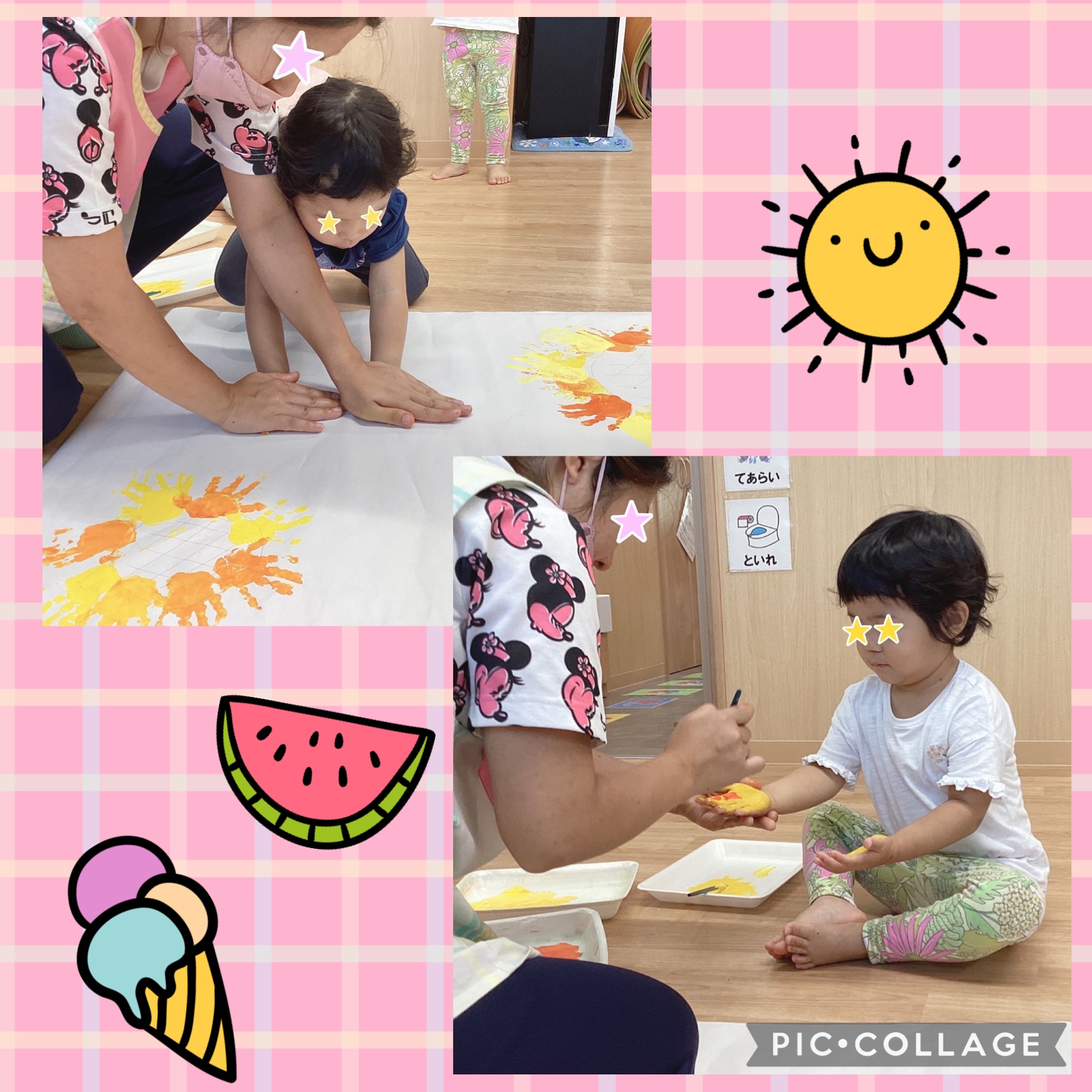 みんなで大きな画用紙に絵の具で塗った手をペタペタ♬