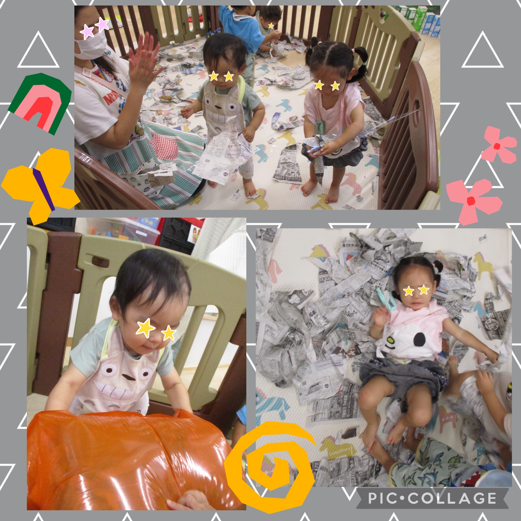 雨の日でも一枚の新聞紙でいろいろな遊びを展開することで室内で楽しく過ごすことができました♪
